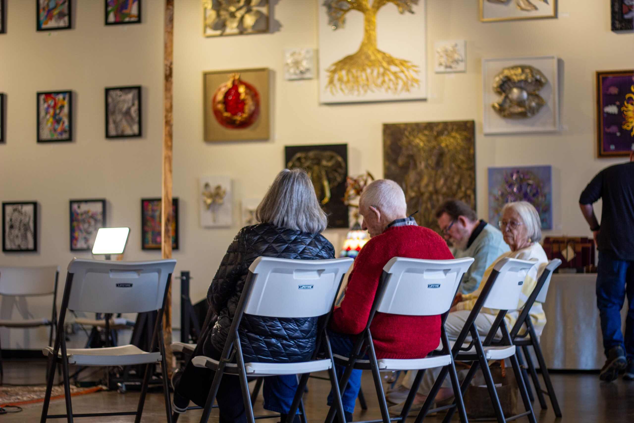 As the room filled, anticipation shifted into attention when Steven took his place for a live conversation with Alexandria Brown of Summit View Marketing. What followed was more than an interview. It was a story told with honesty and reflection. He shared the winding path that led him from illustration and design into a more intuitive, abstract practice rooted in instinct and emotion.